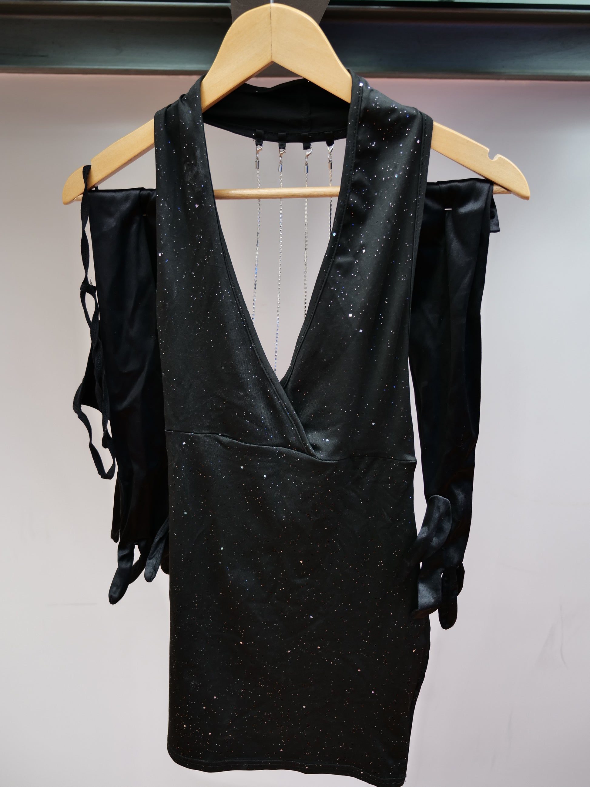 The outfit includes: dress, gloves and thong.